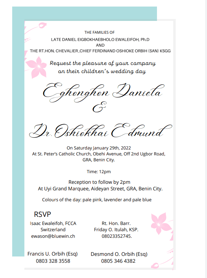 A man shall leave his father and mother and stick to his wife and they will become one flesh. In furtherance of this biblical adjuration, Dr Oshiokhai Edmund Orbih, son of Chief Ferdinand Orbih ,SAN will on Saturday the 29th of January, 2022 wed his heartthrob Eghonghon Daniela and become one with her in holy matrimony.