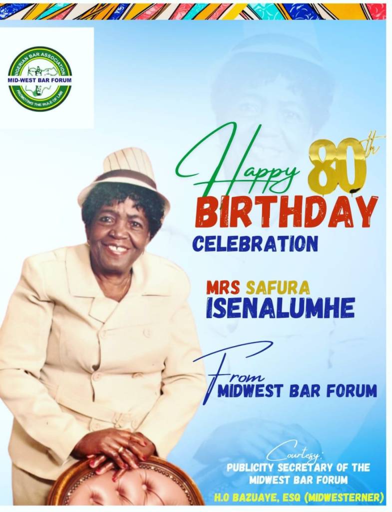 Mrs Safura Isenalumhe is the mother of Razak Isenalumhe, a notable personality in the NBA, Past Chairman, NBA Benin and Bencher. The octogenarian celebrates her 80th birthday today, 26th March, 2022 at the Isenalumhe Family Compound, Eware-Anwain, Etsako West Local Government of Edo State.